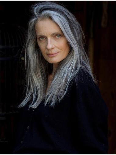 Graue Lace Front Perücke 16" Glattes Echthaar ohne Pony